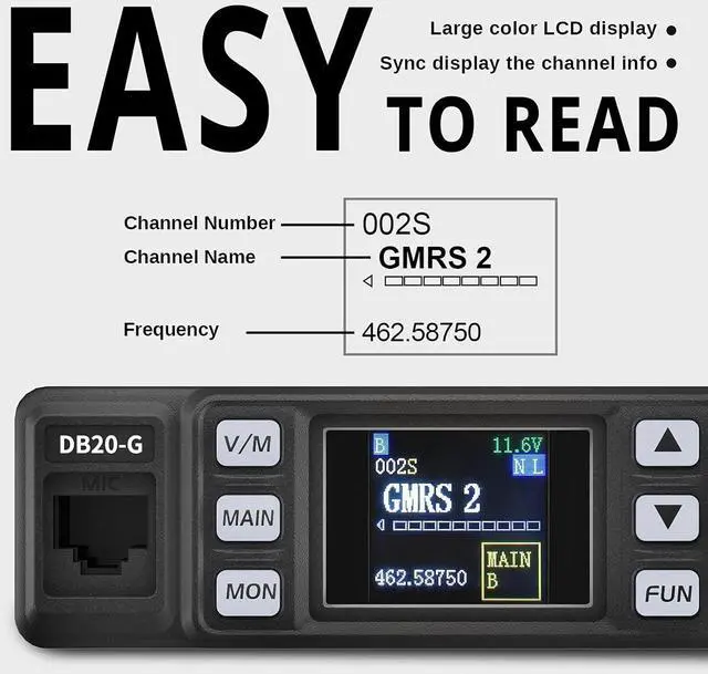 • Unique Features\Differ from other GMRS microMobile radios, DB20-G can sync display channel name, frequency, channel number on the screen; Equipped with a driver-friendly microphone, integrated all control buttons into one handset, which made it easy to make adjustments with one hand on the go.