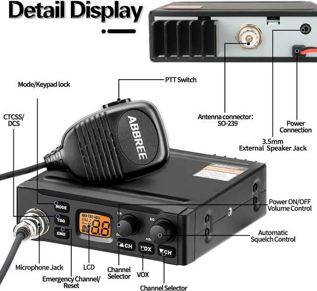 MultifunctionalMeet All You Need4Watts Output, 13.8V Input, 40 Channels Operation, 38CTCSS&104DCS, 26.965 - 27.405MH z frequency range, Orange Backlit LCD Display, VOX Function, AM/FM Dual Mod, ASQ/SQ Control, Keypad Lock, Full Channel Scan, Emergency Radio.