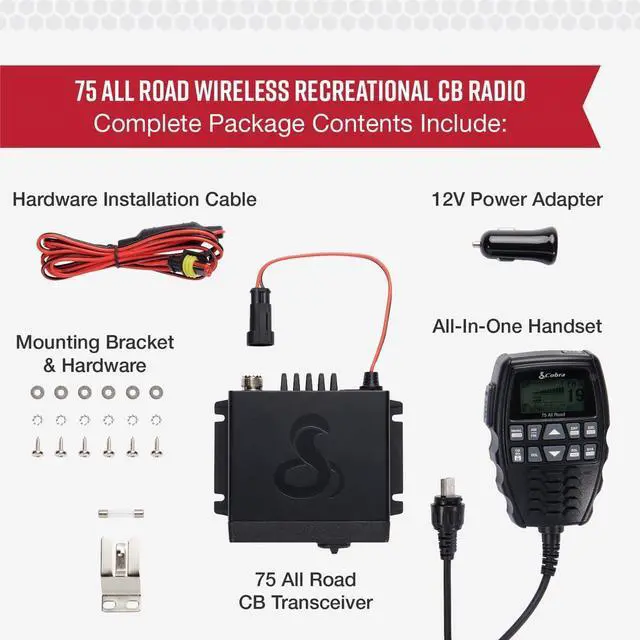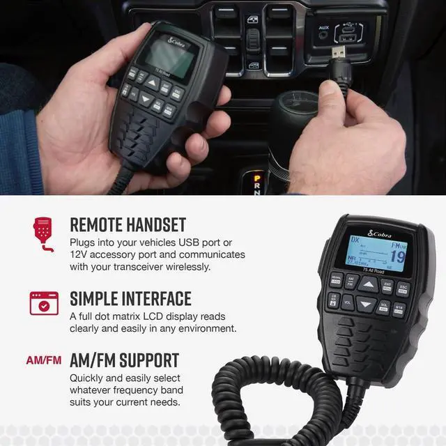 USB or 12V Power The 75 All Road CB radio comes equipped with an all-in-one wireless handset that can be easily powered directly from your vehicles USB port or 12V accessory port.