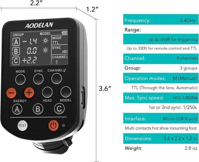 Range: Up to 200m (656ft) for trigge Up to 100m (330ft) for remote control and TTL