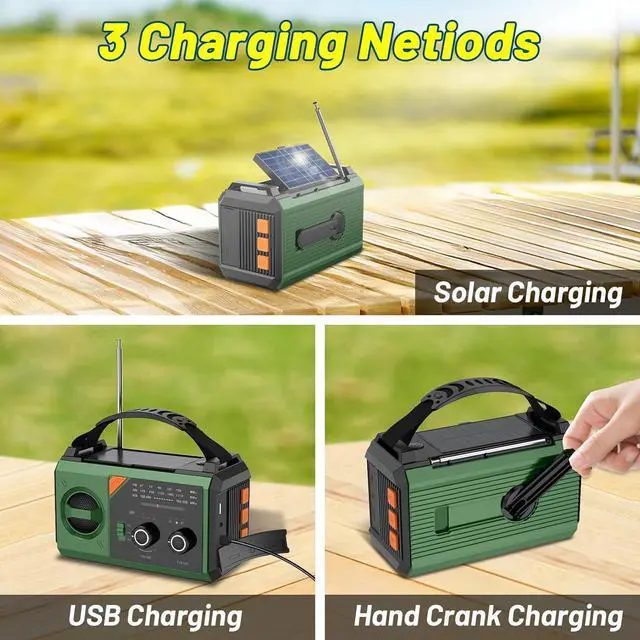 Triple-Power Charging AssuranceNr be without power! Recharge this emergency radio reliably via 3 methods: Efficient solar panel (ideal sunny days), manual hand crank (generate power anytime), or fast USB Type-C c (included). The clear 4-segment battery indicator and charging lights (orange for solar/crank, red for USB) keep you informed. Perfect for your emergency preparedness kit, survival gear, or off-grid adventures.