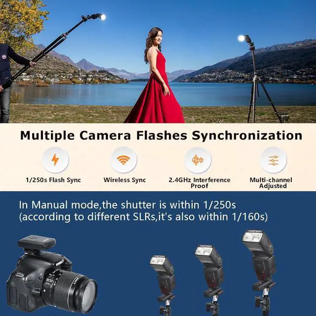 16 Channels, St transmission --Supports multi groups of camera flashes Synchronization, 16 Channels, Maximum synchronous speed up to 1/250s in M mode, transmitting distance up to 30m.