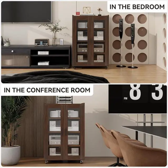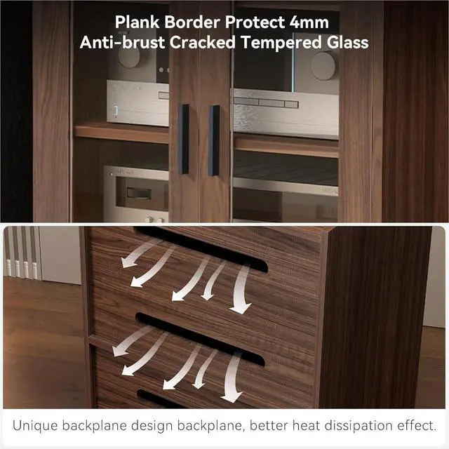 Glass Doors: The AV cabinet's door is made of a combination of wood and 0.16" explosion-proof tempered glass, ensu safety and durability. It allows you to store your items while still providing visibility for display purposes. The tempered glass is resistant to impact and dust, making it easy to observe without affecting the remote control signal. In the unlikely nt that it breaks, there is no risk of getting cut