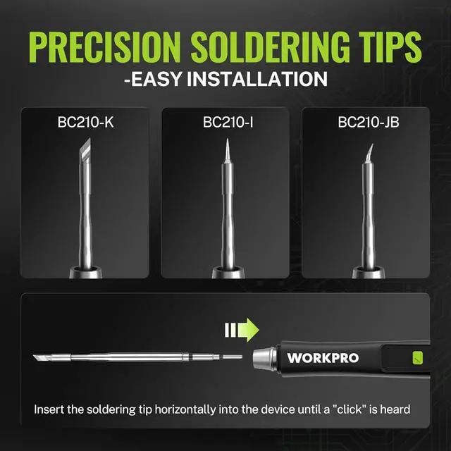Hassle-Free Replacement: Equipped with interchange precision solde tips, this solder kit includes BC210-K, BC210-I, and BC210-JB tips. Unlike traditional models that require unscrewing nuts or removing housings, the tip replacement is tool-freesimply insert the new tip horizontally until it clicks into place, ideal for projects requi different tip styles