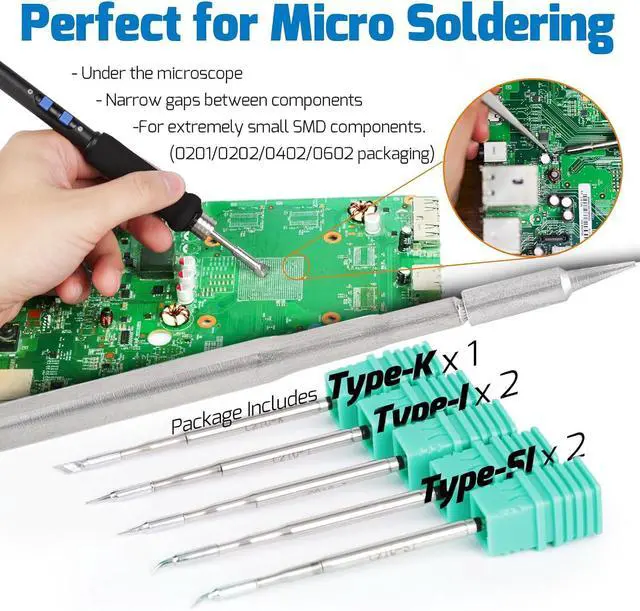 Replacement Solder Iron Tips: this micro solde kit comes with 5 replacement tips; the tips cridge design allows for quicker temperature compensation and more accurate temperature control; the micro solde irons precise and slim design also makes it easier to be observed under the microscope or magnifying glass, making this a great option for entry-ll micro solde
