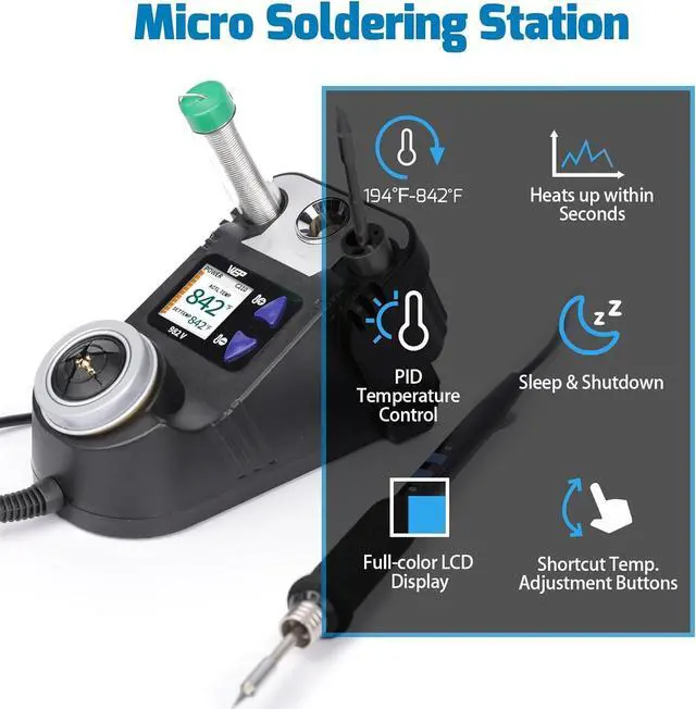 LCD Full-color Display: display shows the precision solde irons set temperature, real-time temperature and simulated power indicator for clear monito