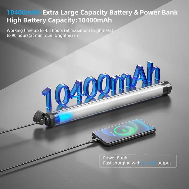 10400mAh Battery & Power Bank FunctionThe RGBW LED video light features a built-in high-capacity 3.7V /10400mAh battery, providing up to 5 hours of continuous lighting at max brightness. A Type-C charging port is located on the bottom of the lamp tube, allowing you to use it while charging without worrying about low power. The video light tube also functions as a power bank, making it versatile for various devices
