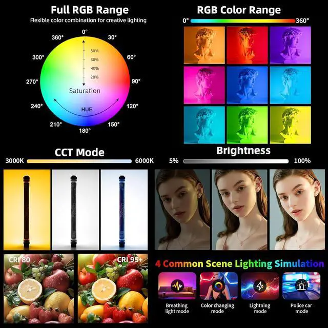 APP ligent ControlThis photography lights can be seamlessly connected via a mobile app, you can easily select your preferred lighting color or scene modes through the apps color palette. Equipped with full RGB color capability, the LED light wand not only ens versatile color via the remote control, but also offers more personalized options through your smphone. Whats more, the app supports group control functionality, making it easy to manage multiple light sticks simultaneously