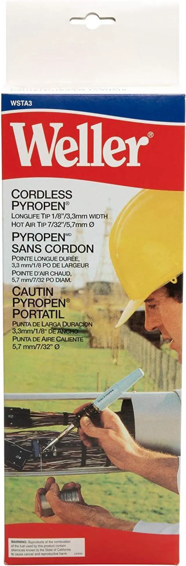 The Pyropen WSTA3 is a lightweight and completely port solde iron ideal for field service jobs. Does not require a cord, batteries, or a charge. This unit heats up in 30 seconds and it's temperature adjusts from 392° F to 932° F. The sturdy metal tank holds enough gas for three hours of operation - butane sold separately. Inactive hot air nozzles for low temperatures are avail. UL listed. Made in Japan.