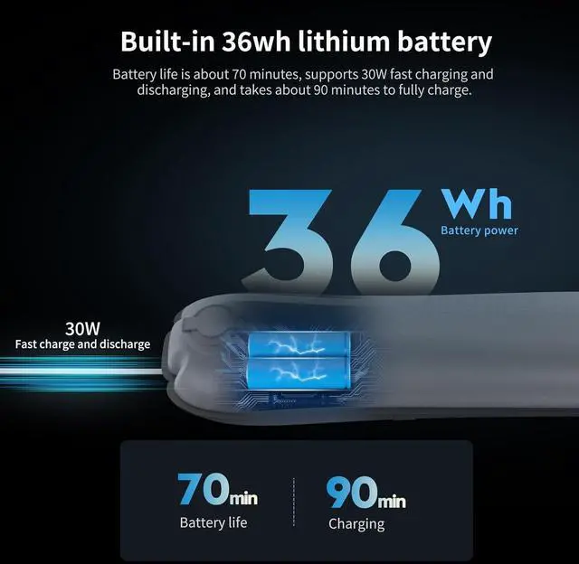 Built-in 5000mAh BatteryEquipped with a 36Wh/5000mAh recharge battery and a fast-charging chip, the GC30 supports 30W fast charging and discharging. It fully charges in just 90 minutes and offers up to 70 minutes of runtime at 100% brightness.