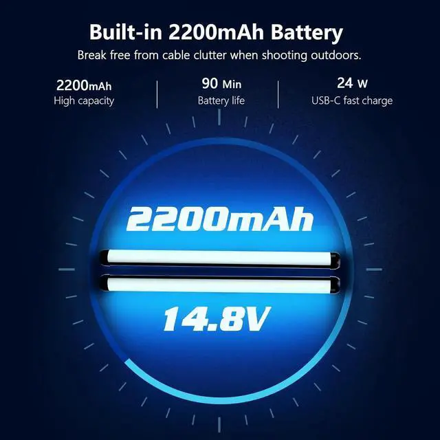 Built-in Recharge BatteryBuilt-in 14.8V 2200mAh recharge battery, the RGB light wand can be used continuously for nearly 90 mins at maximum power. The USB Type-C charging port on the back of the light tube simply charges with the USB c (Included), and 2 hours for a full charge. It can be used while charging, suit for indoor or outdoor shooting, and nr worry about running out of power.