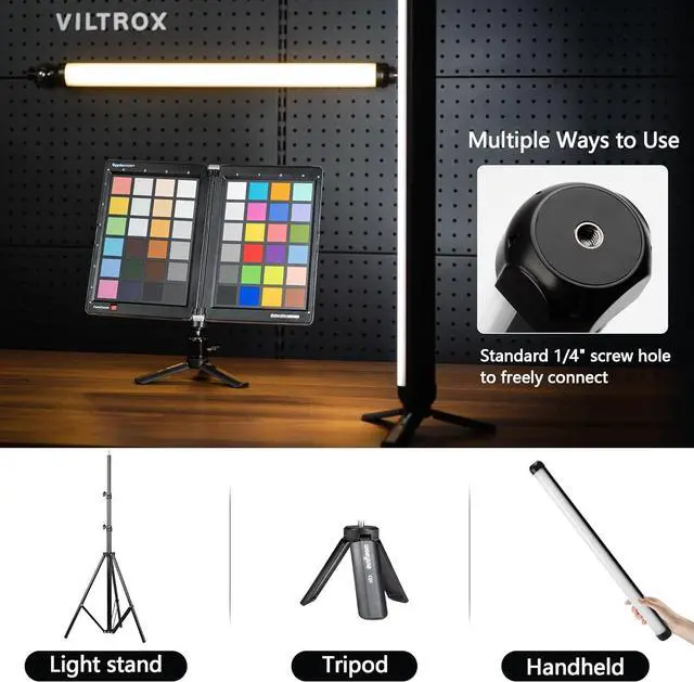 Standard Dual 1/4 Nut HolesBased on diversified needs, we have a specially designed standard nut hole at the top and bottom of the LED camera light stick, which is convenient for external photography camera auxiliary equipment to get better lighting effects. The light is suit for DSLR cameras, camcorders, tripods, light stands, etc.