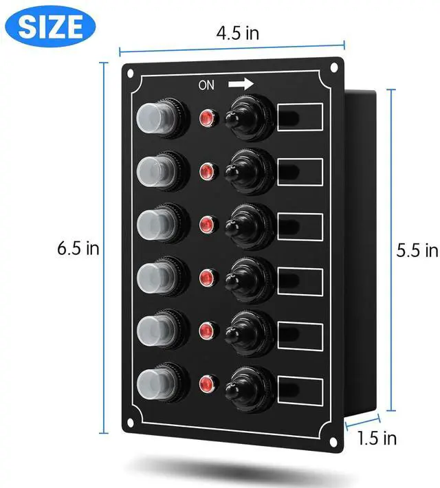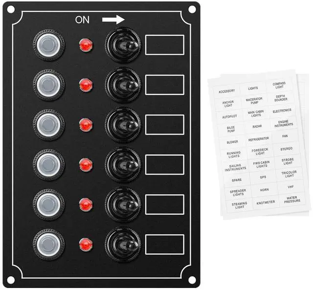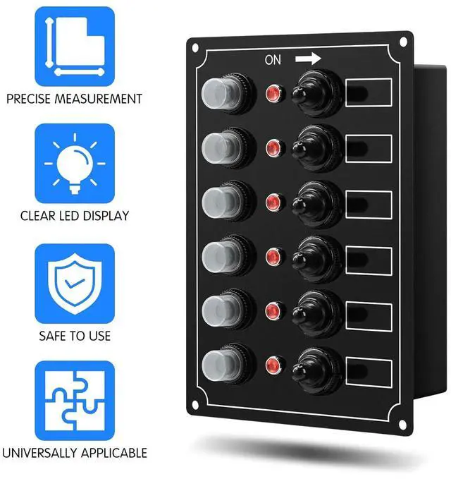 Our 6-Gang LED Switch Panel comes complete with push-button reset breakers, toggle switches and LED indicator lights. Widely applicable for marine boat car RV vehicles trailer bus truck yacht launch pleasure-boat etc.