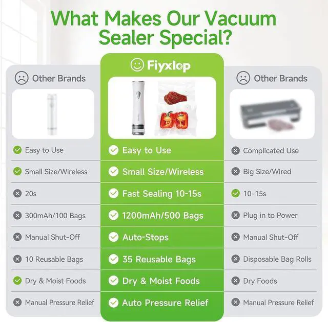 Small Products Big Sets: This is a big set with 45 items, and you can get all of them with the purchase of one handheld vacuum sealer - 1 vacuum sealer for food, 1 water tank, 35 sous vide bags, 6 sealing clamps, 1 charging cable, 1 instructions. Unbeatable value for money