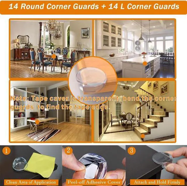 28 CLEAR CORNER PROTECTORS - Suitable for right-angled "corner" tables, chairs, cabinets, etc. We improved all appliance' stickiness by using a new generation of reinforced genuine 3M adhesive tape, which can adapt to various furniture surfaces, and is stronger and more durable.