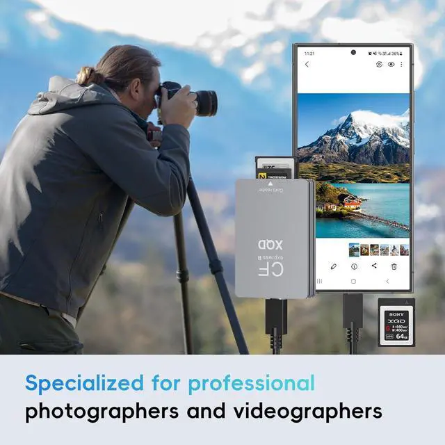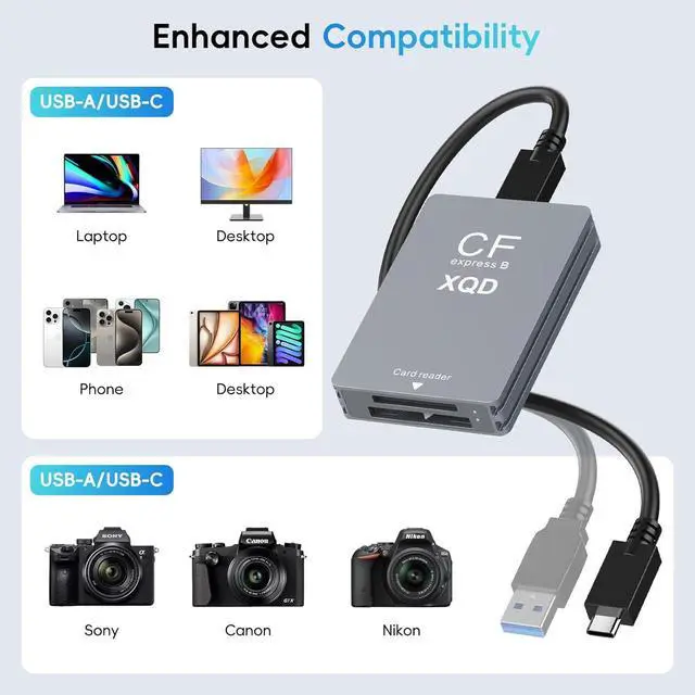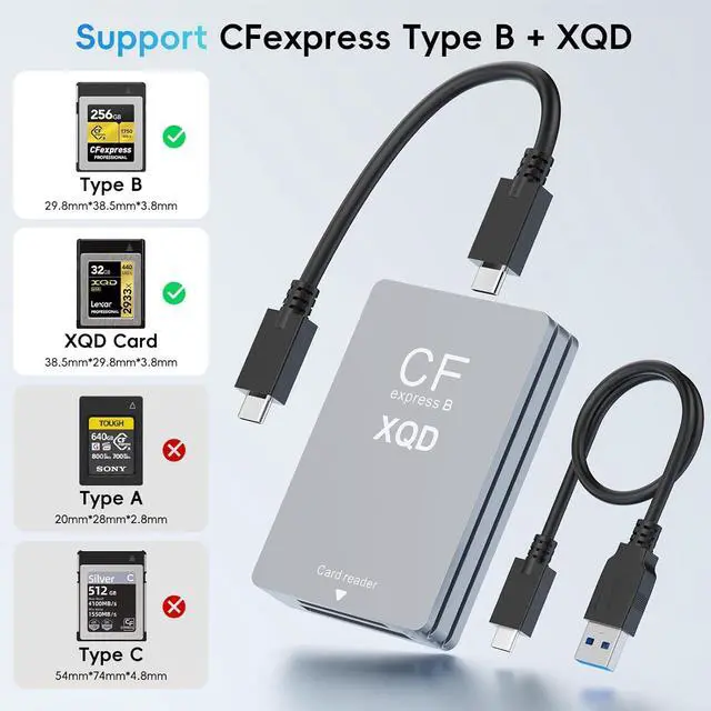 Enhanced CompatibilityThe card reader for CF Express Type B is highly compatible with Class B CFexpress (SanDisk/Sony/ProGrade//TOPSSD CFexpress Type B series) and perfectly for XQD Sony G-series and M-series card, 2933x, 1400x