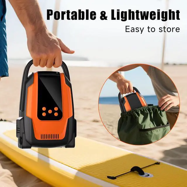 High-denition LED Display & Light Lamp: The large-size LED digital screen clearly displays the real-time air pressure and preset pressure values, and the data reading is intuitive and convenient. The paddle board pump also has a built-in multi-function lighting lamp, providing a white light lighting mode, so that the inflation operation at night is clearly visible. The specially equipped SOS red light and flashing mode provide safety protection for outdoor activities.