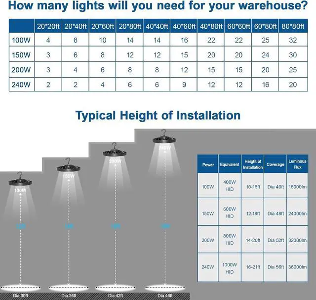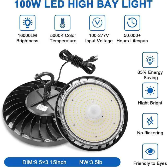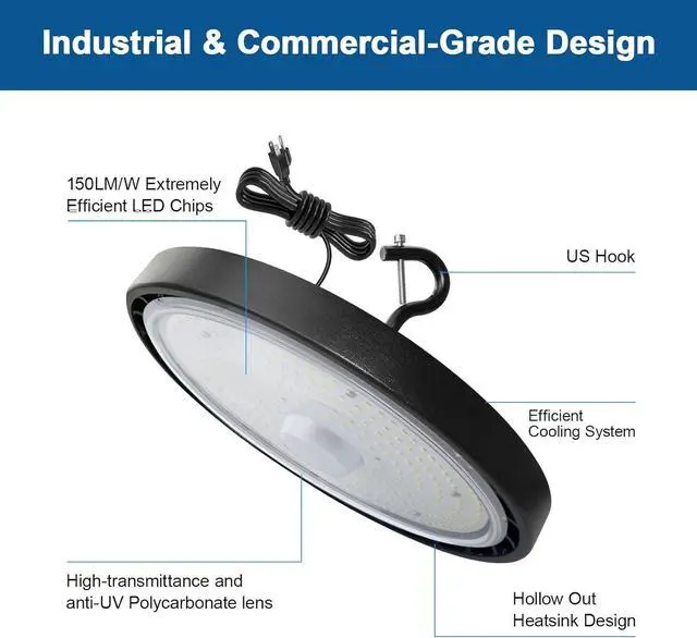 Easy to install: This UFO LED high bay light features a ceiling mounted design and can be easily installed in garages, workshops, warehouses, barns, shops, or any other space in just 3 minutes.