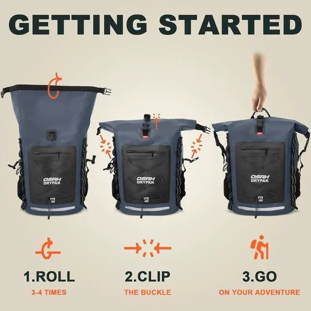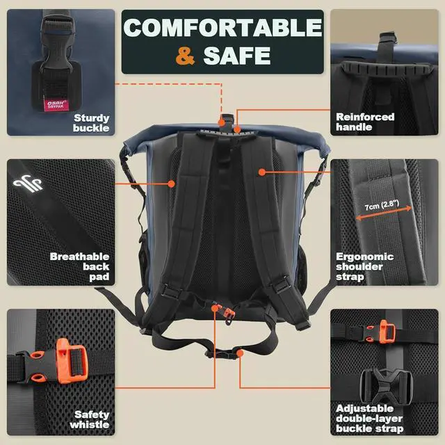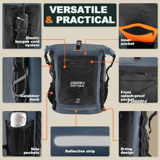 - Features like a reflective strip for night visibility, D-ring attachment points, carabiner hook, and adjustable double-layer buckle straps make this backpack ideal for hiking, kayaking, motorcling, and travel.