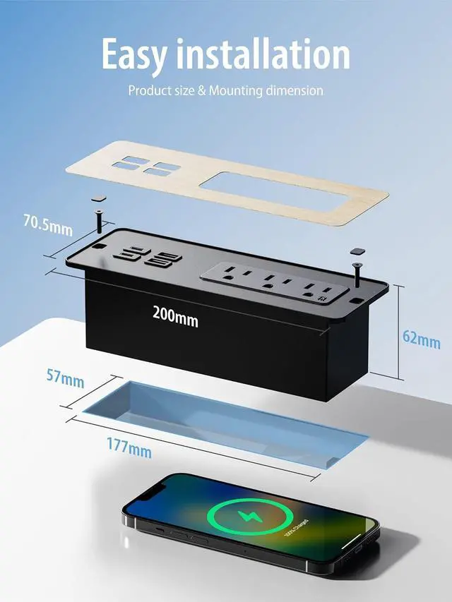Power strip dimension: W 2.78" *L 7.87" *D 2.44" (W 70.5 *L200*D62mm). It'll come with a cut template paper and install screws. Suitable for conference table, nightstands, gaming desk, sofa table or kitchen furniture. You can do some DIY work to make charging more convenient.