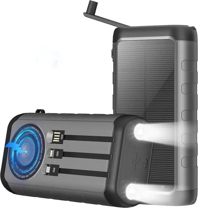 ve Different Charging Methods: 59800mAh External battery charger with solar panel can recharge by sunlight, outlet(2 input ports & 1 input cable) or hand crank generator. However, solar charging is affected by the intensity of light and its area, so the charging time will be very long, and solar charging can only provide a trickle of current. The power bank's cable is slower than the USB-C output port and is only suitable for emergen use. It is recommended to use a fast-charging head and cable to charge through the USB-C port for daily use.