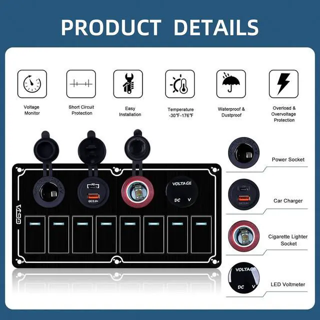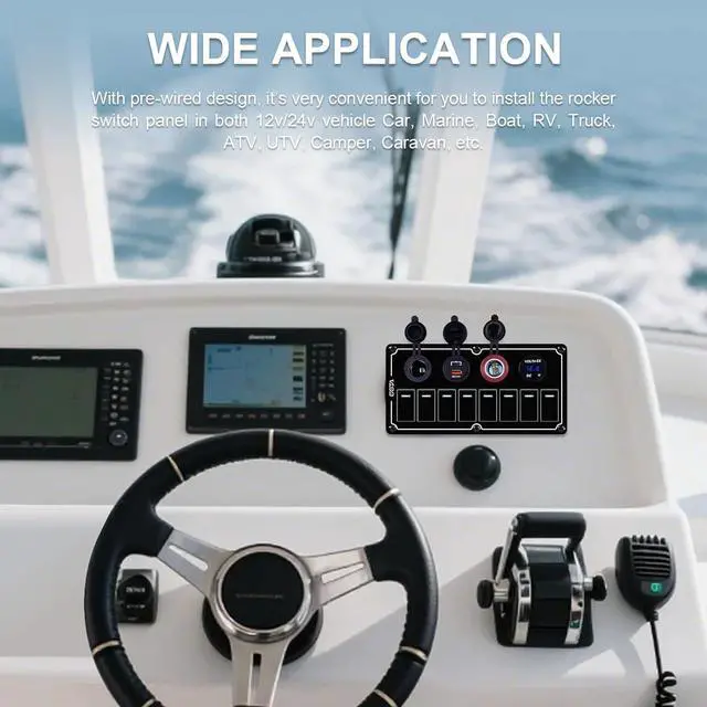 3. Multiple Safety Protections for Peace of Mind Rocker Switch Panel With built-in multiple protection mechanisms, it effectively prevents accidents and ensures power safety. The IP65 waterproof rating offers dust and water resistance, making it suitable for outdoor and vehicle-mounted scenarios. Whether in car modications, yachts, off-road vehicles, or trucks, it can be safely used in various environments, allowing you to use it without worries.