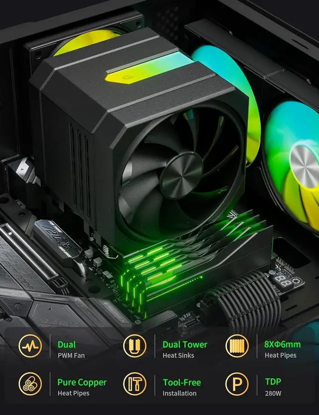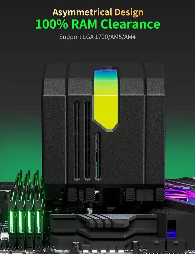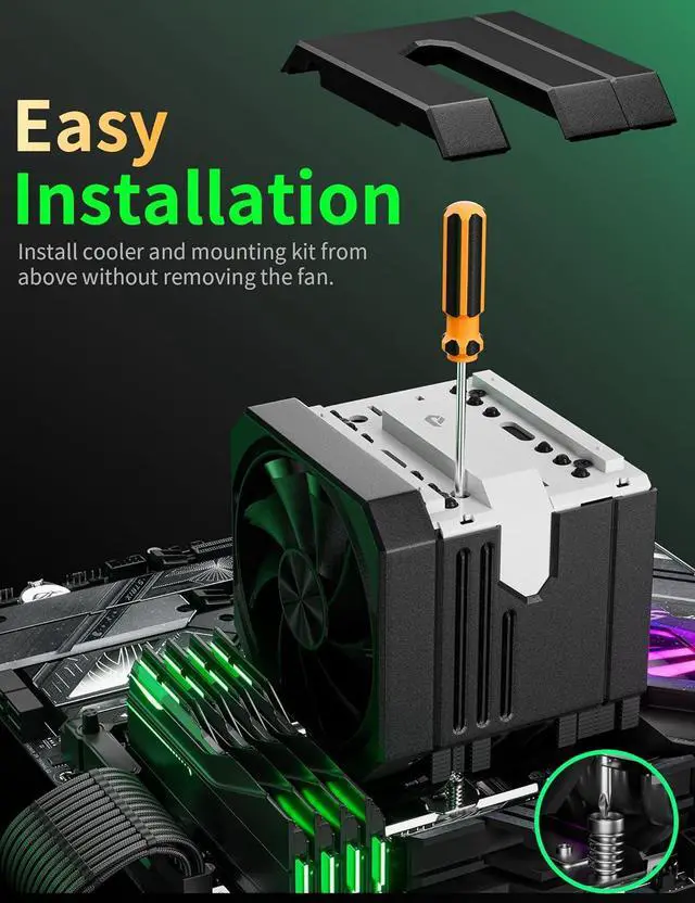 RAM: Our cpu cooler for am5 features non-disassembly fan installation for hassle-free setup, allowing you to install the cooler without removing your motherboard or RAM. Designed with clearance for memory modules, ensuring compatibility with tall RAM modules and preventing obstruction of slots.