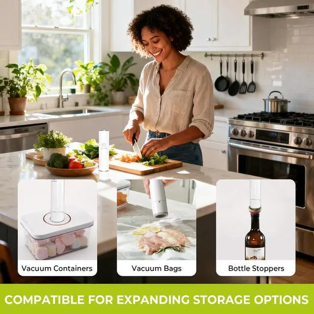 COMPATIBLE: Compatible with common valved vacuum containers, vacuum bags, and bottle stoppers. This handheld vacuum sealer for food protects nuts, coffee, snacks, and fragile bakes, expanding storage options with the compact vacuum sealer.