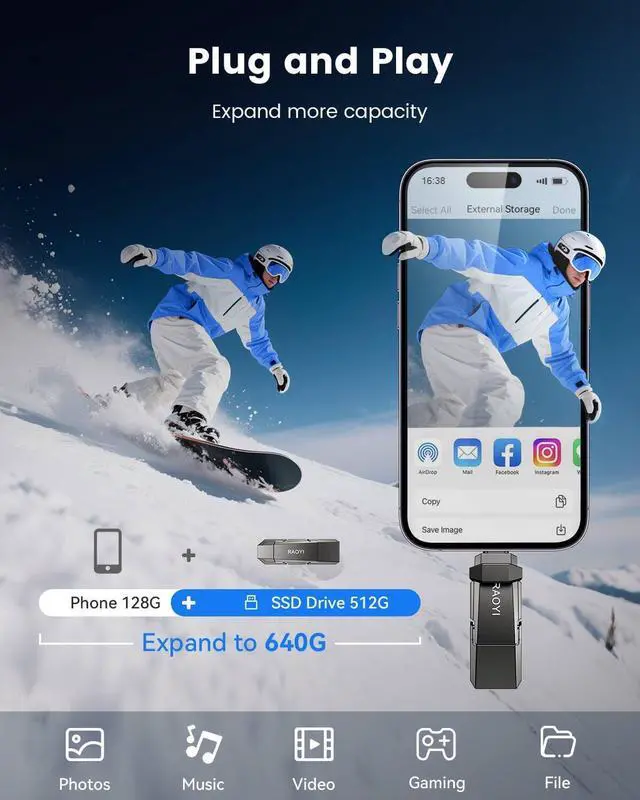 Play: This high speed USB ssd drive features huge capacities to offer you plenty of storage space; Just plug in and quickly free up space. It supports Windows, Linux, Android, and Mac OS, and also backward compatible with USB 3.1, USB 3.0, USB 2.0. Default format is exFAT. (Not compatible with lightning port. )