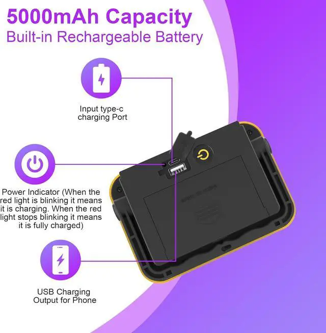 180°Adjustable & Rechargeable Design180° handle adjustable design, you can adjust the direction and angle of the light to enhance the lighting coverage. This portable violet light with rechargeable design saves your worries for outdoor electricity. In addition, the led violet work light can be used as a portable battery in emergen situations, able to charge your cell phone and other electronic devices.