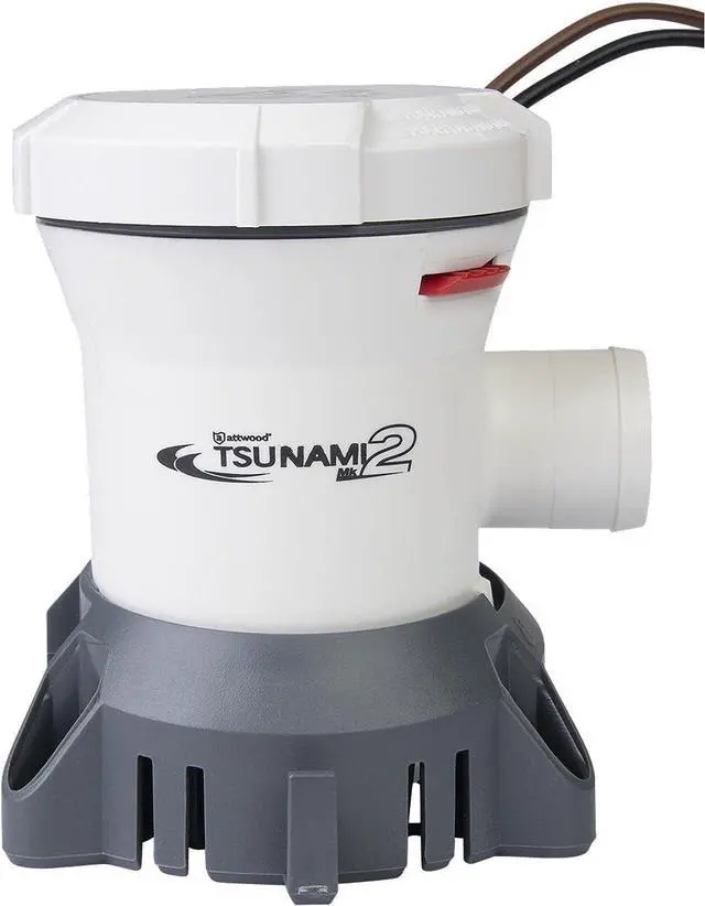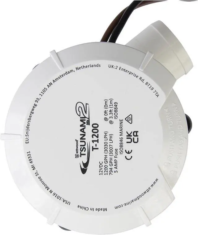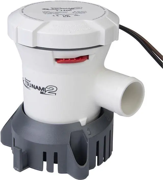 • PN 5612-7, 1200 GPH, 12V, Fuse size: 6A, Outlet type: 1" & 1-1/8" barbs, Check valve: yes, Wire length: 29"