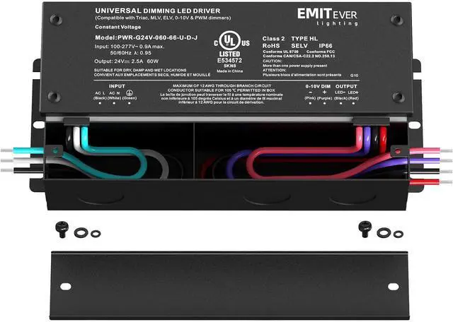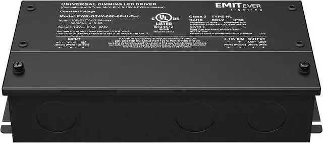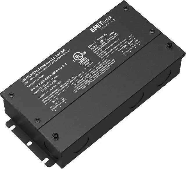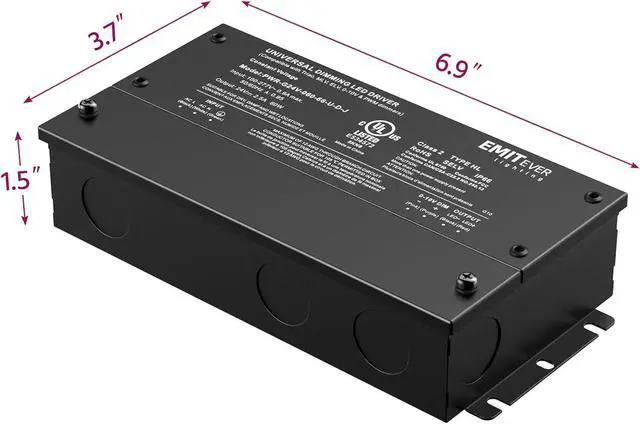 SPECICATIONS: cUL us Listed, Class 2, Class P, Type HL, FCC compliant, damp location rated. Free air convection cooling within low prole compact aluminum housing (only 1.5 -inch tall). Mounting foot at both ends allows for screw down upon flat surface for complete installation.