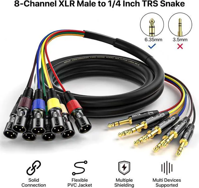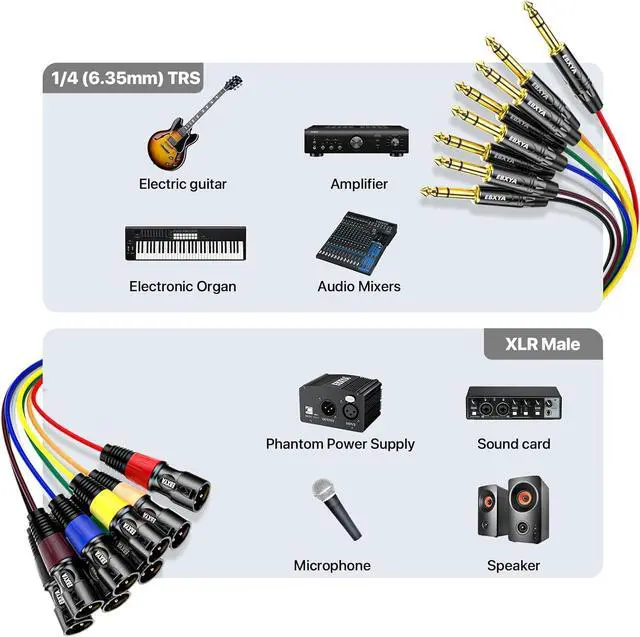 Anti-Interference Design: 8-channel XLR Male to 1/4 Cables feature a 24AWG oxygen-free copper conductor and multiple shielding designs, effectively reducing signal interference. The TRS connector employs gold-plating technology to minimize further electromagnetic interference (EMI) and radio frequen interference (R), ensuring high-delity audio signal transmission