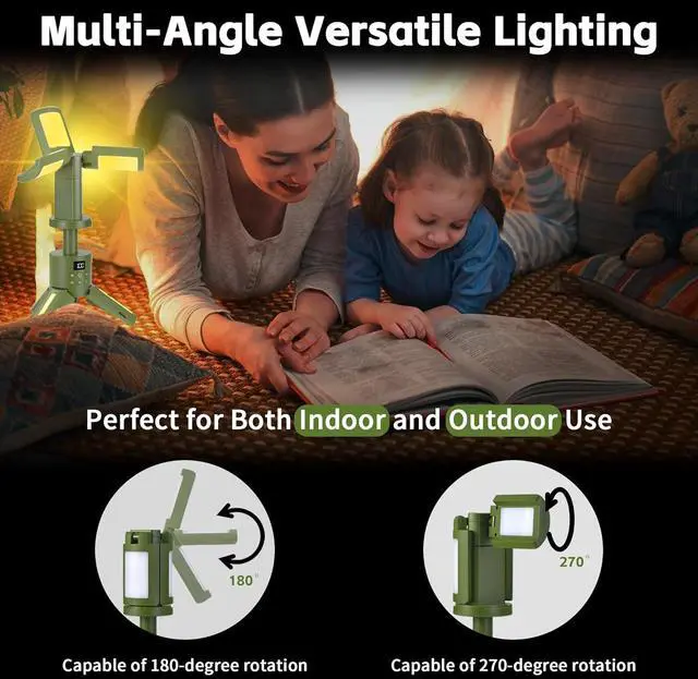 Adjustable 5 Brightness Levels & 9-Color Lighting: Enjoy stepless brightness adjustment up to 6000 Lumens, with 9 color options (red, orange, yellow, green, an, blue, purple, and white) for various settings and mood lighting. This Portable rechargeable camping Light with stand gives you full control over your camping outdoor lighting experience.