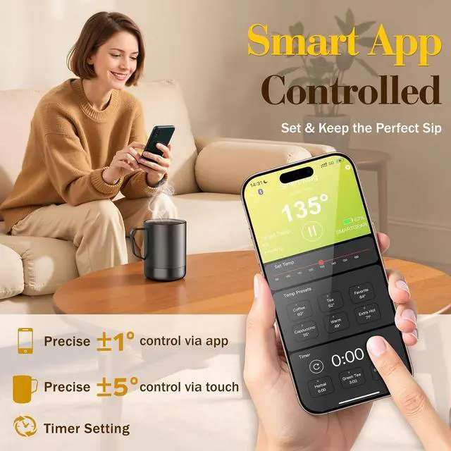 SMART OR SIMPLE Customize the temperature using the app. If you don't want to use the app, the mug warmer will rem your last set temperature so you can enjoy a smooth experience every time.