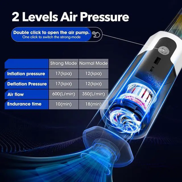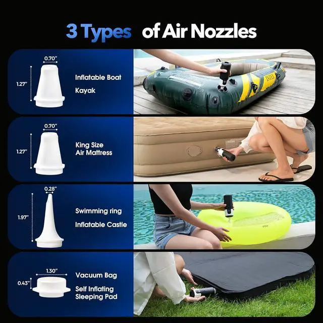 Wide Compatibility: 17 is equipped with 3 different air nozzles that can easily meet your needs for various inflatable products. 17 can h you save time on inflating Kayak, air mattresses/air beds, pool floats, inflatable pools, pool toys, inflatable furniture, swimming rings, and more, save your time and energy. Designed high pressure with a small size, it's perfect for home and outdoor adventure