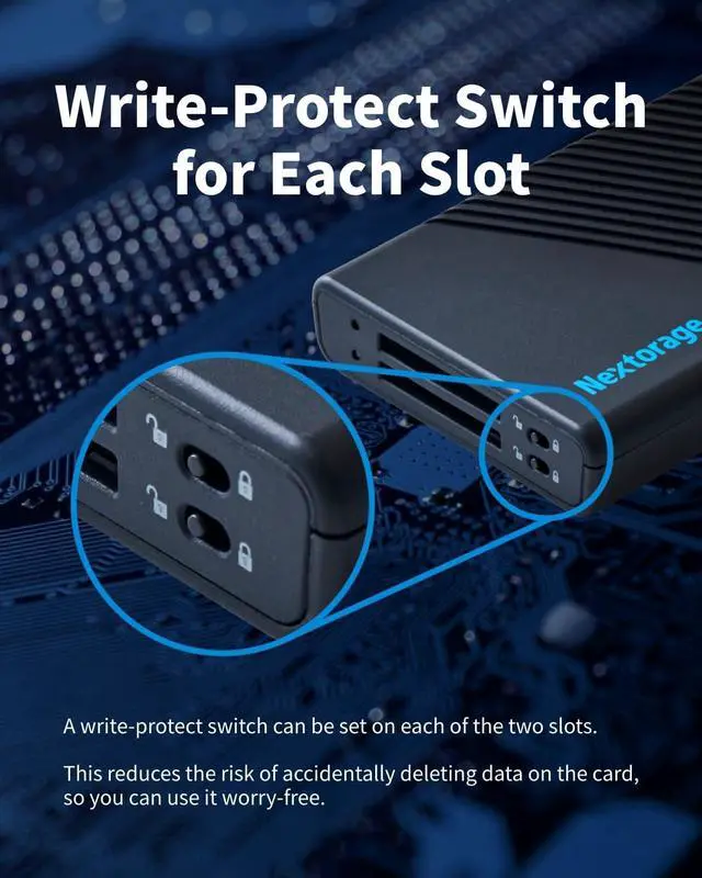 Write-protect switch: The card reader has a write-protect switch that can be set for each of the two slots, so you can use it with peace of mind, as it reduces the risk of accidentally deleting card data.