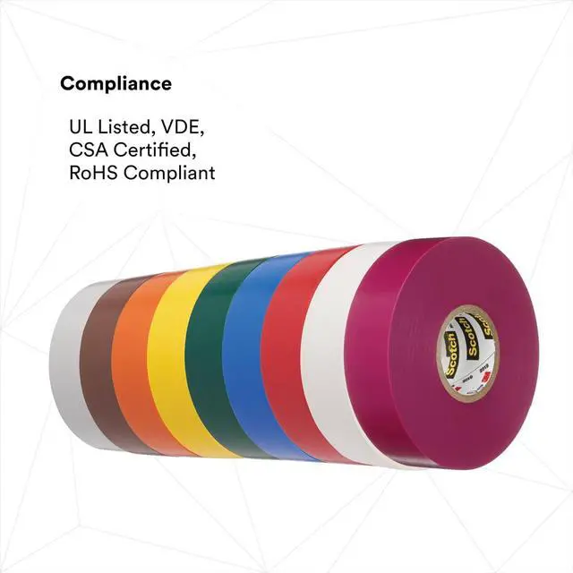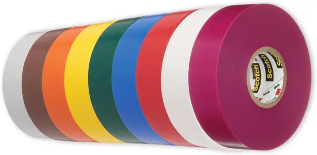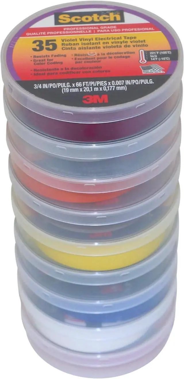 is a premium grade, 7-mil thick electrical insulating tape. Each roll is either 1/2 inch wide x 20 feet long or 3/4 inch wide x 66 feet long depending on the pack purchased. Flame-retardant, weather-resistant; resists UV rays, abrasion, moisture, alkalies, solvents, many acids. One of each of 9 colors comes in each set. Colors include blue, brown, green, grey, orange, red, violet, white and yellow (the 8-pack leaves out the grey). The 3-pack contains black, white and red. For indoor and weather-protected outdoor applications. Stretches to conform to virtually any shape that requires color-coded insulation. Outstanding electrical and mechanical properties make Scotch 35 excellent for use in phase identication, color coding of motor leads and piping systems, and for marking safety areas. A brand of 3M.