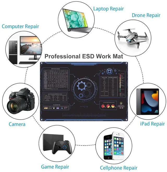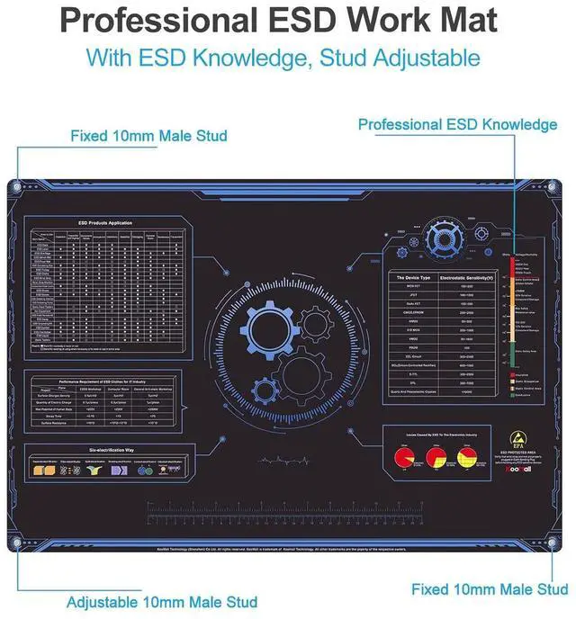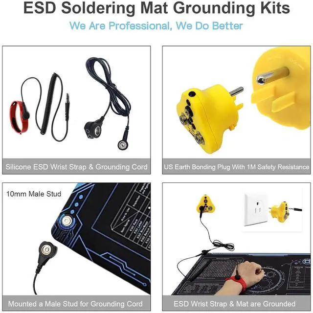 WHAT YOU GETComes with a US Grounding Plug, a ESD Wrist Strap and Grounding Cord with 2 Holes. The anti static Mat is mounted 2pcs 10mm Male Studs as the Grounding Point which is easy for Grounding Cord to connect the mat stably.