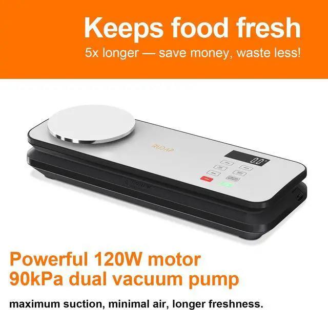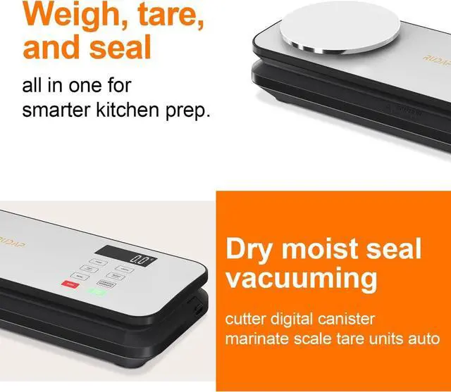 Effortless Clean, Compact Style vacuum sealer smooth-nish body resists smudges and wipes clean instantly. Features a tool-free twist-off stainless steel weighing tray no crumbs left behind. Style redened prole stores anywhere, disassembling in seconds for drawer-ready convenience.
