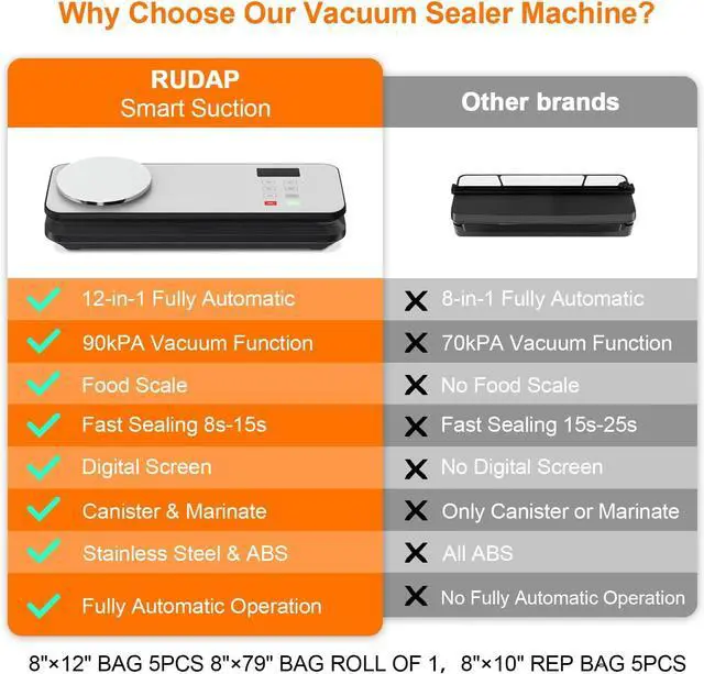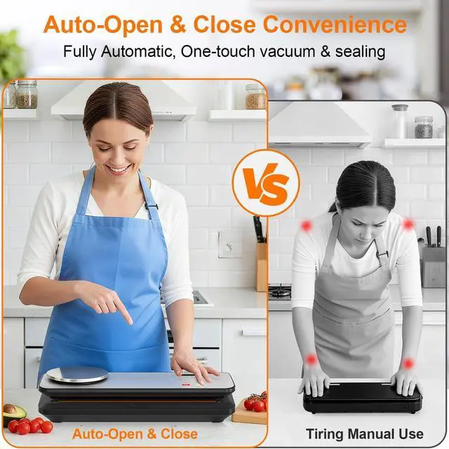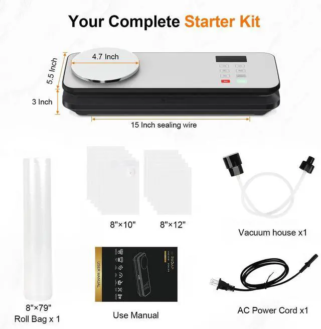 Safe & Cool to Touch, Seal Non-StopOur vacuum sealer is ETL certied for quality and safety. Made with durable ABS and stainless steel materials, its safe to use and free from allergy risks. The food vacuum sealer uses a 12V low-voltage heating wire to prevent burns while ensuring a strong seal, with full silicone seals on the top and bottom for extra durabilityperfect for soups, sauces, or jui meats. Safe for repeated use, its ideal for meal prep or bulk storage.