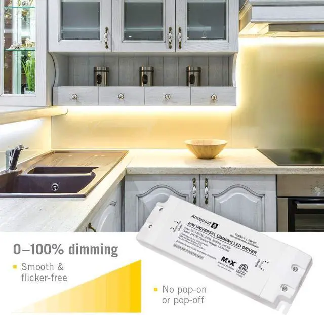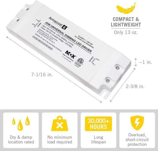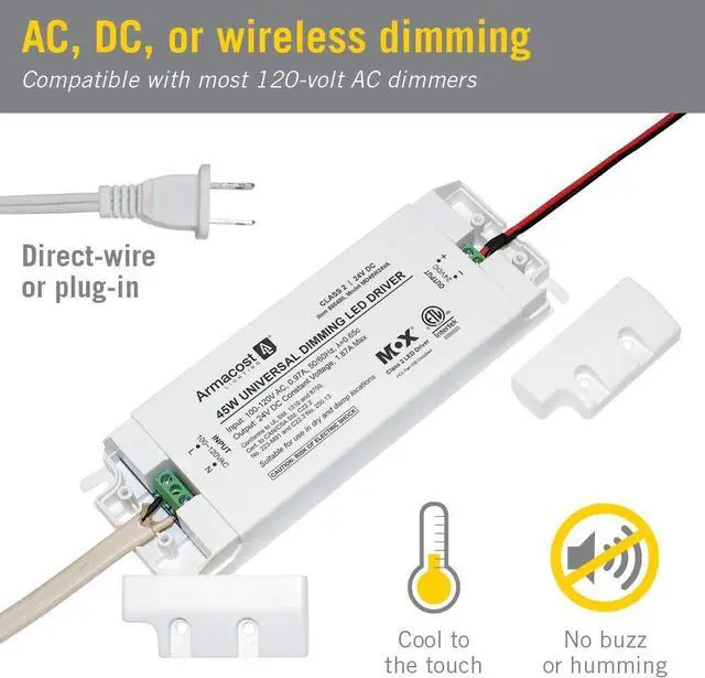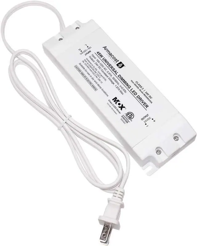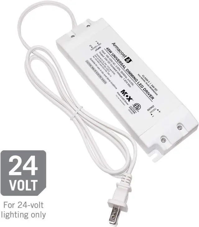 The 45 Watt; 24 Volt Universal Dimming LED Power Supply delivers stable and energy-efcient, low-voltage power to any LED lighting installation. The LED driver is designed using high-performance, professional grade electronics that provide stable 0 or 100% dimming free of any pop-on or drop-off. The power supply is rated up to 45-watts at 24-volts. For the best results use LED lights, switches and dimming light controls. Plug-in or hardwire with detachable AC power cord. Suitable for both dry and damp locations.
