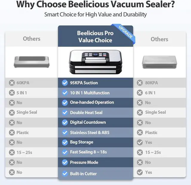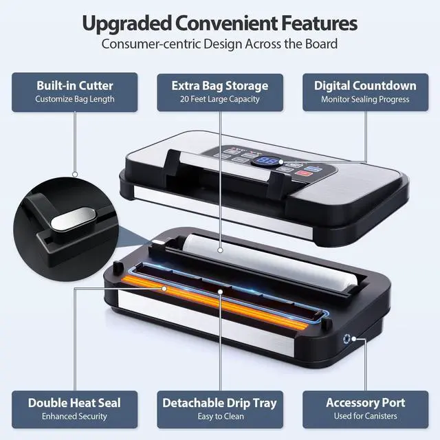 Upgraded User Experience DesignBuilt-in Bag Roll Storage & Cutter - Easily access and customize bag sizes, saving you time and energy. Countdown Display - Provides real-time feedback on sealing progress. Stainless Steel Surface & Removable Drip Tray - Easy to clean and maintain.