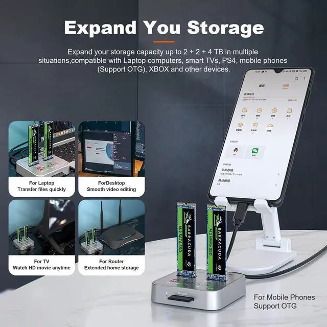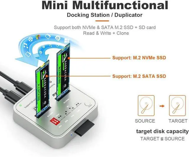 Wide Compatibility Works with M. 2 SATA SSDs, M. 2 NVMe SSDs, and SD Express 7.0 / 7.1 cards. Supports reading/writing of two M. 2 SSDs simultaneously. Fully compatible with Windows / Mac / Linux systems.