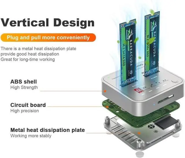 Efcient Heat Dissipation Equipped with bottom cooling holes and non-slip silicone pads, ensuring stable performance and extended SSD lifespan while keeping the docking station secure on your desk.