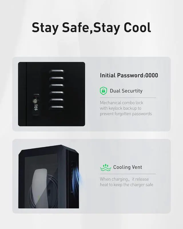 Enhanced SecurityFeaturing a digital padlock for easy locking and unlocking, this enclosure ensures the security of your charger, giving you peace of mind that it won't be lost or tampered with.