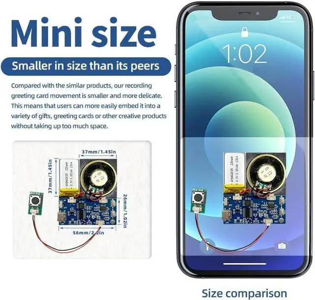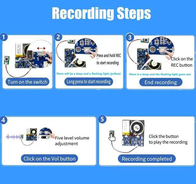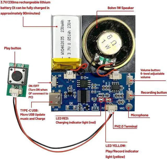 USB Charging Recording Module This recording module features a rechargeable design and is equipped with a big-capacity 3.7 V battery (230 mAh) fully charged takes approximately 90 minutes, played for about 120 minutes. It can be conveniently charged via the Micro USB-Type-C interface. This design extends the battery life, allowing for prolonged usage without the need for battery replacement. You can easily charge it by connecting it to a computer or using a charger, ensuring a full battery and enabling long-lasting usage with repeated charging cles.
