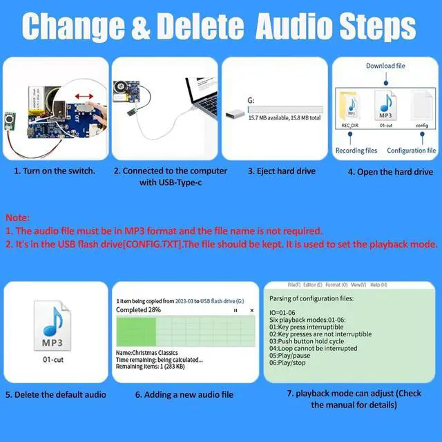 16 MB Storage Capacity This sound module boasts a spacious 16MB memory, providing ample storage space to accommodate multiple favorite songs or recordings. By connecting the module to a computer using a USB-Type-C cable, you can effortlessly add new audio les to the internal storage. This opens up a world of possibilities for your creativity, allowing you to easily modify and update the stored audio content according to your preferences and needs.