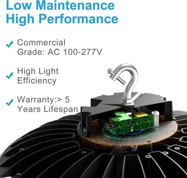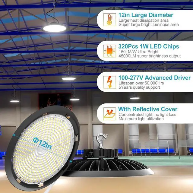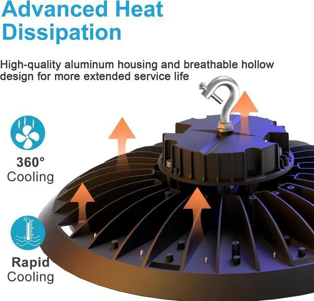 Military-Grade Cooling System: 50, 000-Hour Lifespan 12-inch aerospace-grade aluminum heat sink + ring-shaped heat dissipation n design Reduce light decay to < 5% over 5 years. Built-in surge-protected 100-277V driver withstands voltage fluctuations, ensuring 7+ years of 24/7 operation even in -40°C~122°F extremes.