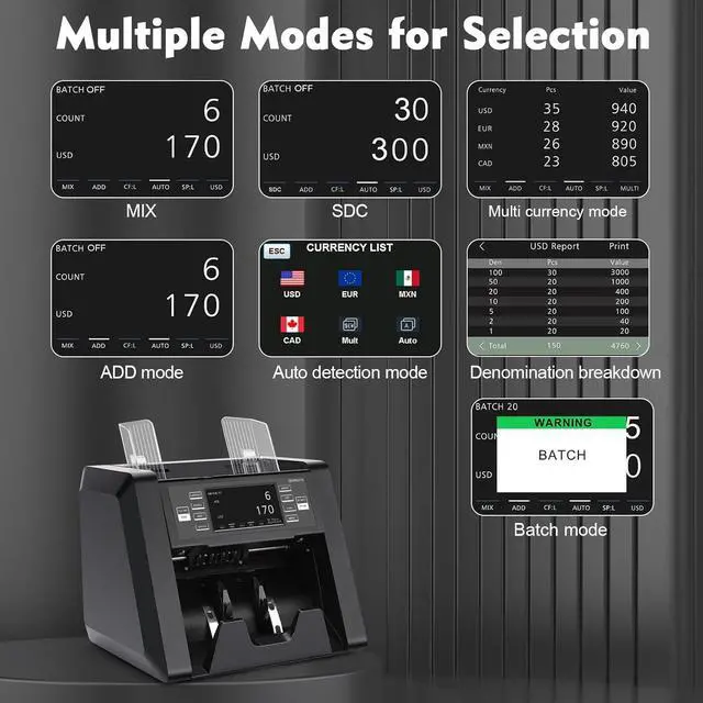 Reliable Counterfeit Detection & Business Guard: Mixed denomination cash counting machine has various counterfeit detection methods to ensure your bills authenticity. CIS, UV, MG, IR, MT, RGB light source checks every security feature on banknotes, effective against superdollar.